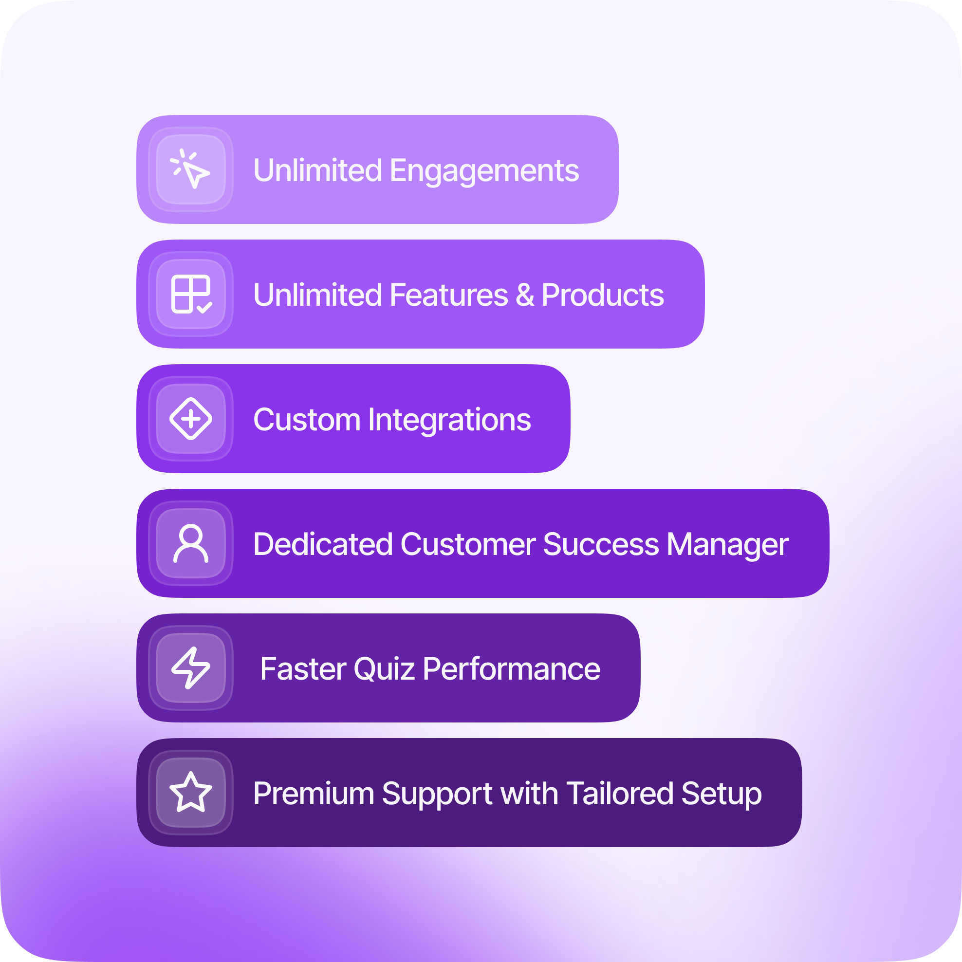Quizell Enterprise gives you the tools, performance, and support required to operate complex funnels across teams, markets, and high-traffic environments.